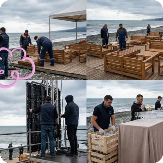 Един от наш екип ви придружава от началото до края — монтаж, пристигане на гостите, координация с доставчиците и разглобяване. Вие се наслаждавате на събитието, докато ние се грижим за детайлите.