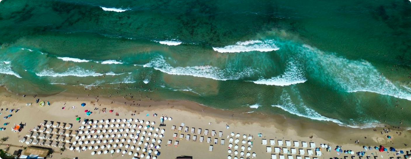 От юни до септември температурите се движат между 24°C и 34°C, а морската вода достига 21–27°C. Вятърът е обикновено лек до умерен морски бриз. UV индексът е висок – препоръчваме слънцезащита, тъй като на плажа има малко естествена сянка.